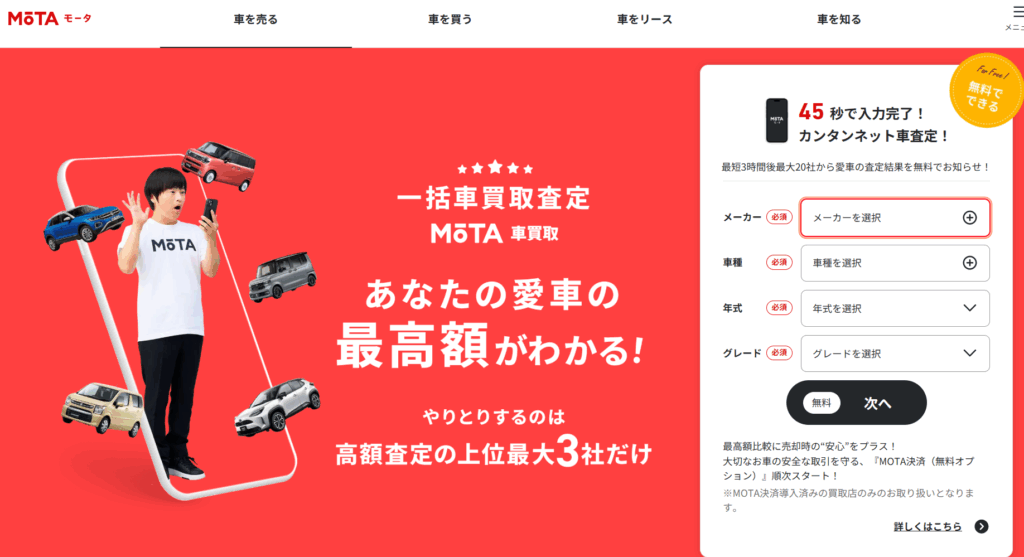 MOTA車買取 | (株)MOTA | 1,000社以上 | 翌日午前中に入札結果 | 高額査定の上位3社のみと交渉 |