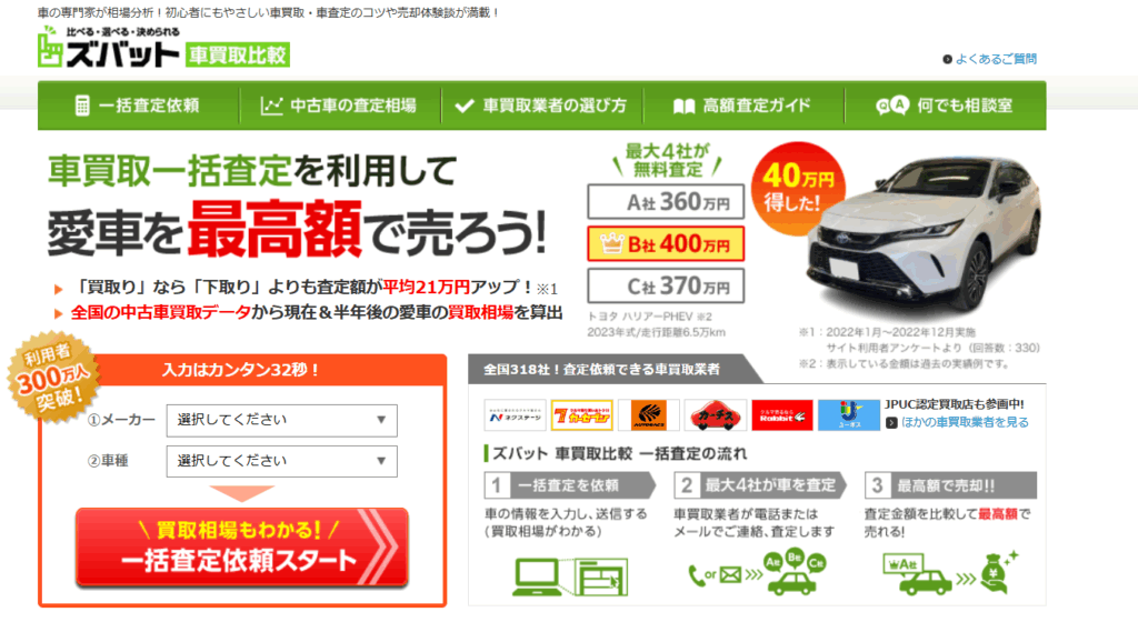 - 3位:ズバット車買取比較|老舗の安定感と豊富な実績